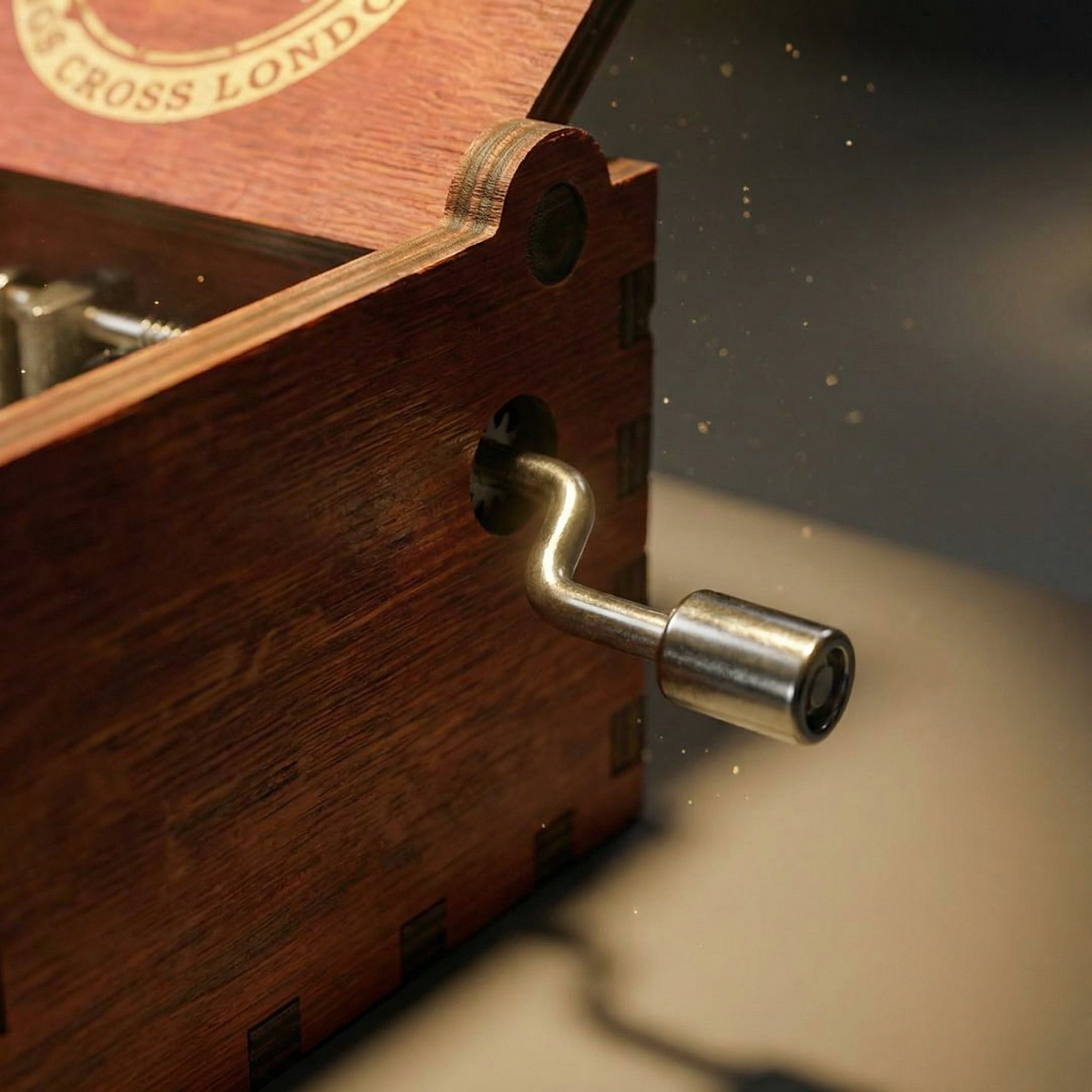 Mecanismo musical de manivela manual que funciona sin baterías. Diseñado para durar generaciones y crear momentos mágicos una y otra vez.