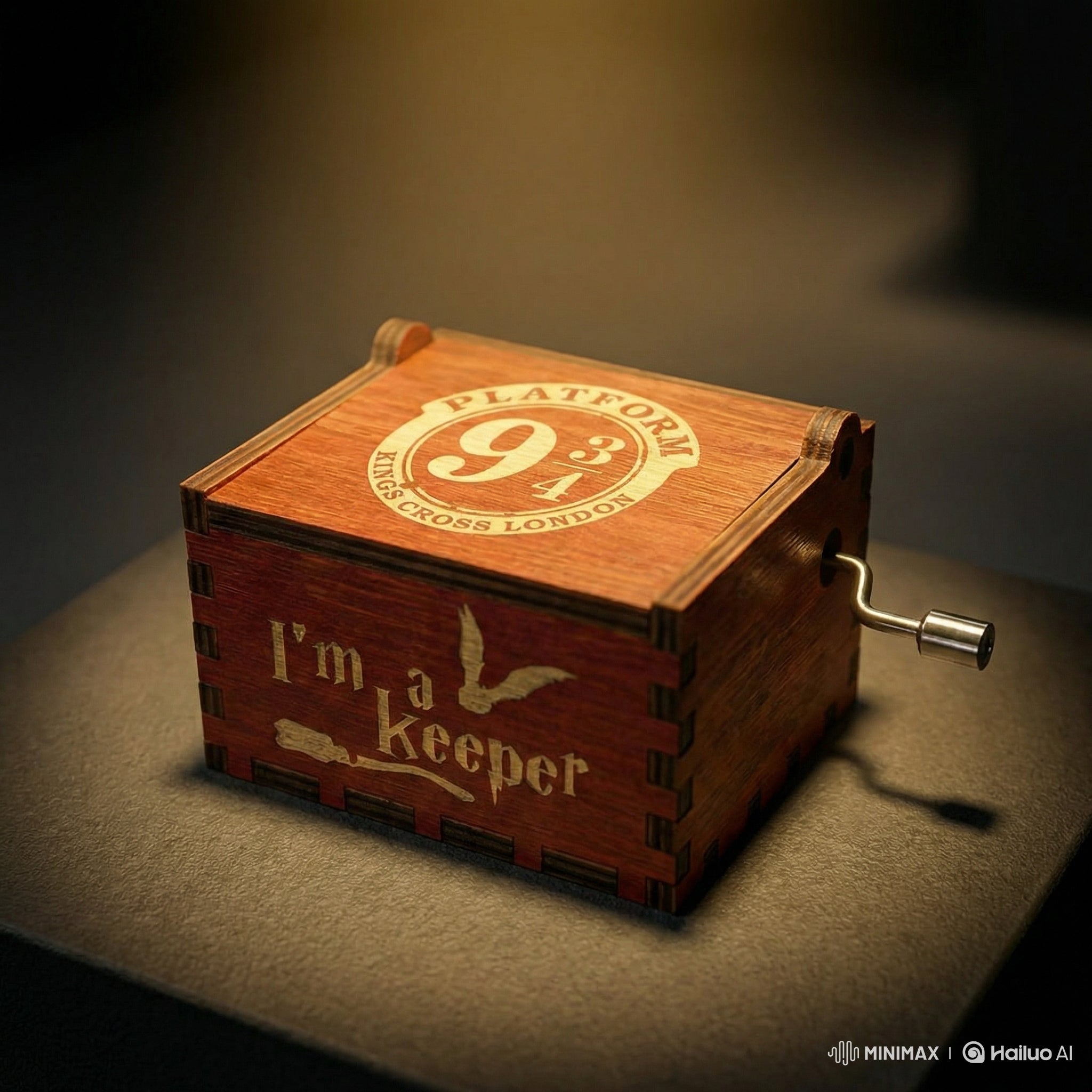 Caja musical de madera tallada con diseño oscuro y mecanismo de manivela manual. Disponible en múltiples variantes con melodías icónicas.